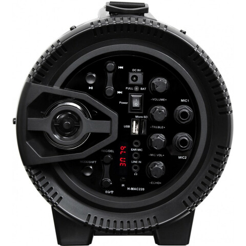 минисистема, без оптического привода, радиоприемник FM, поддержка форматов MP3, воспроизведение с USB, подключение: Bluetooth, линейный аудиовход, функция караоке