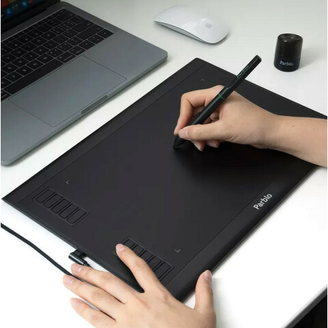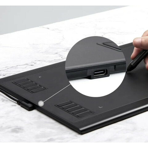 графический планшет формата A4, рабочая область 340x220мм, чувствительность 5080 lpi, скорость отклика 266rps, безаккумуляторное перо с 8192 уровнями нажима, 10 горячих клавиш, интерфейс: USB-C