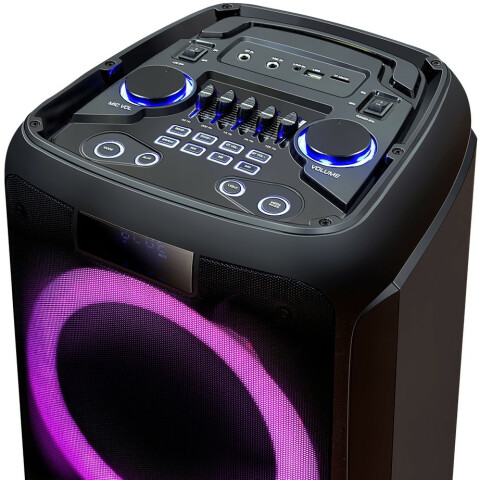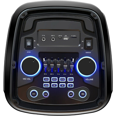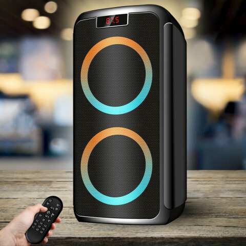 портативная акустика стерео, мощность 100 Вт, Bluetooth, USB, питание от сети, от батарей, поддержка карт памяти, радиотюнер, пульт ДУ