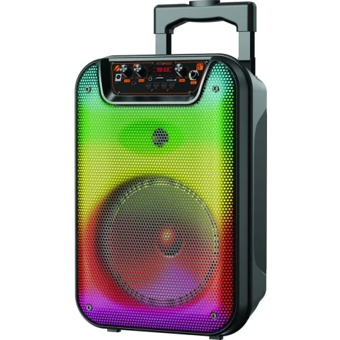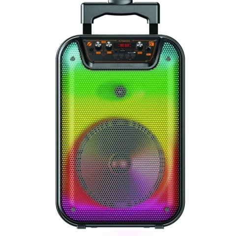 портативная акустика моно, мощность 18 Вт, корпус из пластика, Bluetooth, USB, питание от батарей, поддержка карт памяти, радиотюнер, пульт ДУ