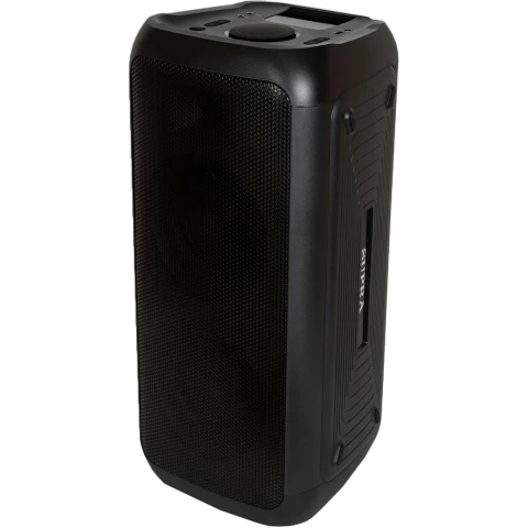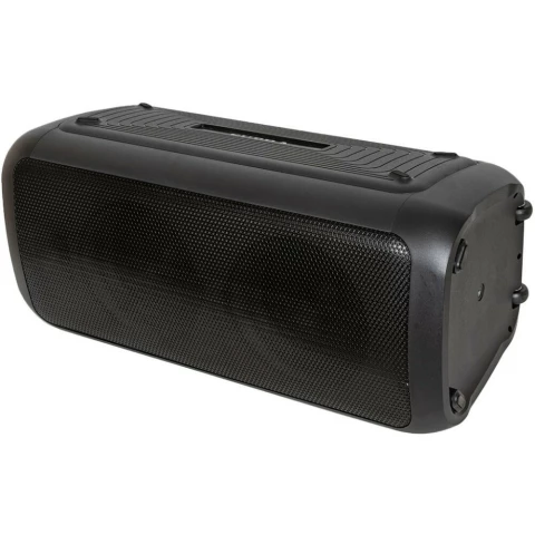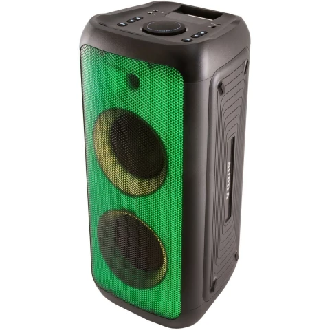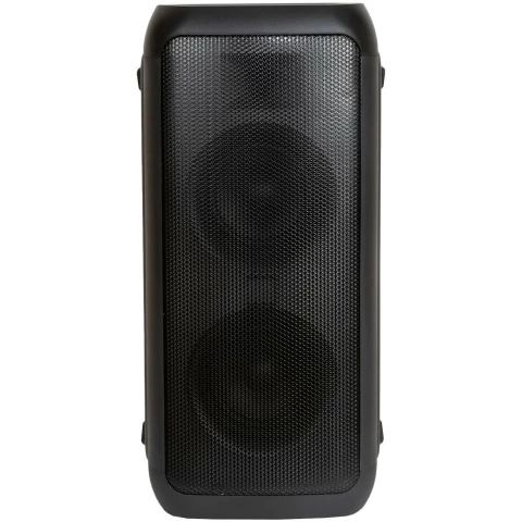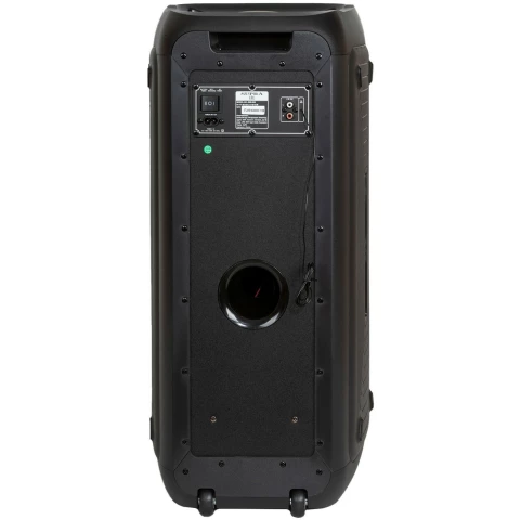 портативная акустика моно, мощность 180 Вт, корпус из пластика, Bluetooth, USB, питание от батарей, поддержка карт памяти, радиотюнер, пульт ДУ