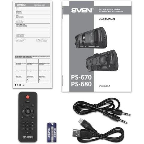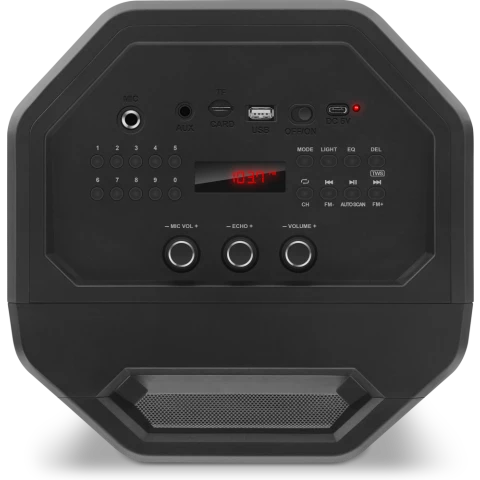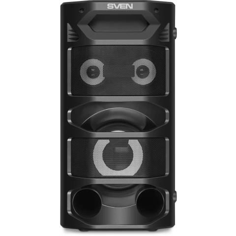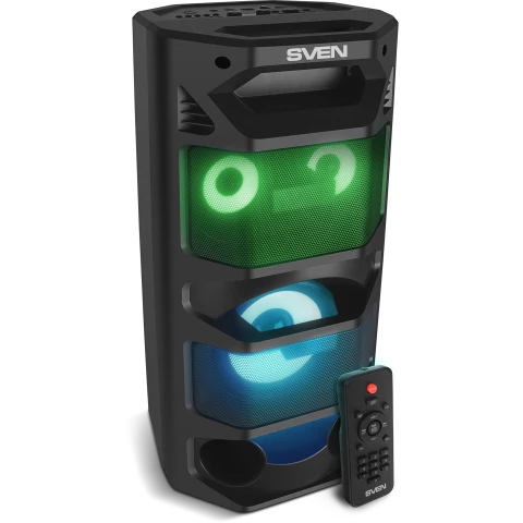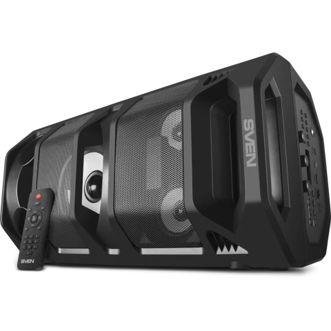 портативная акустика стерео, мощность 65 Вт, корпус из пластика, Bluetooth, питание от батарей, поддержка карт памяти, пульт ДУ