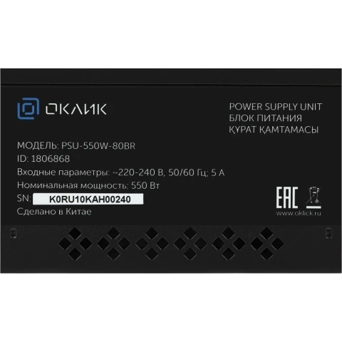 Бренд: Oklickмощность 550 Вт, ATX12V 2.31, активный PFC, вентилятор 120 мм, cертификат 80 PLUS Bronze