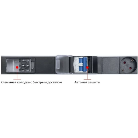 вертикальный блок розеток для 19" шкафов, 16 розеток Schuko, 8 розеток IEC 320 C19, макс. мощность: 7.4 кВт, 32А, автомат защиты, алюминиевый корпус, клеммная колодка