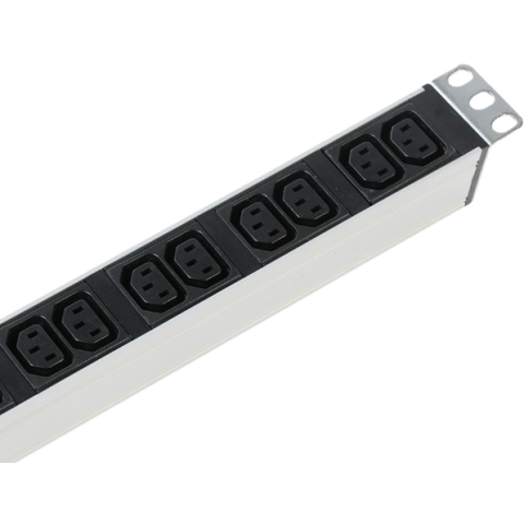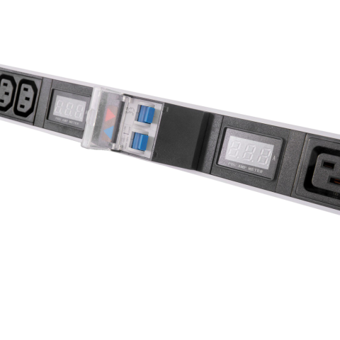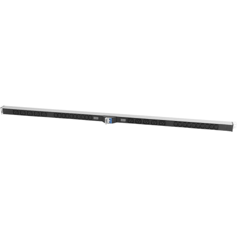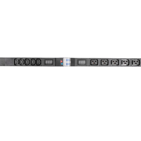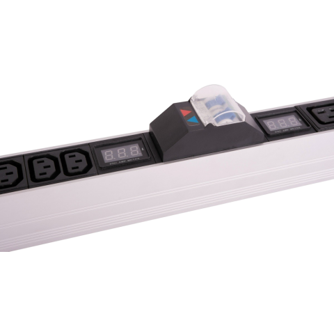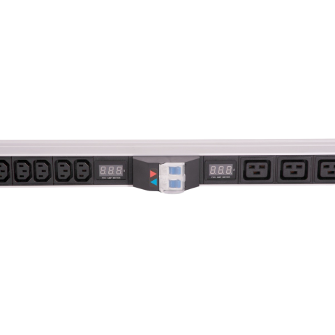 вертикальный блок розеток 33U 19", разъемы на 2 контура: 5x C19, 10x C13, с автоматом, и амперметром, 2x 16A, 7-8 кВт, алюминиевый корпус, для шкафов 33-48U, колодка, IP20, без шнура