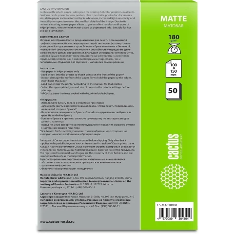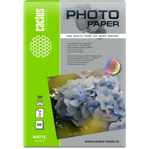 фотобумага, матовое покрытие, формат: A6, 180 г/м2, количество листов: 50 шт.