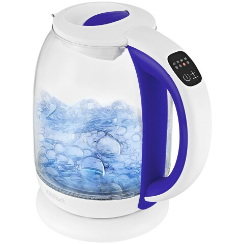 Бренд: Kitfortчайник, объём: 1.7 л, мощность: 2200 Вт, закрытая спираль, материал корпуса: стекло, подсветка воды при работе, поддержание тепла