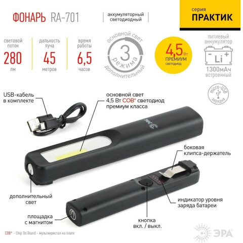 тип: ручной, световой поток: 280 лм, дальность освещения: 45 м, максимальное время работы: 6.5 ч, встроенный аккумулятор