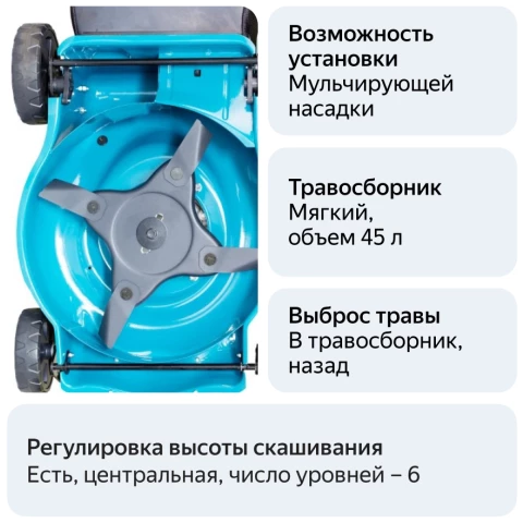 колесная газонокосилка, бензиновый двигатель, ширина скашивания: 42 см, высота скашивания: 25-75 мм, выброс травы назад