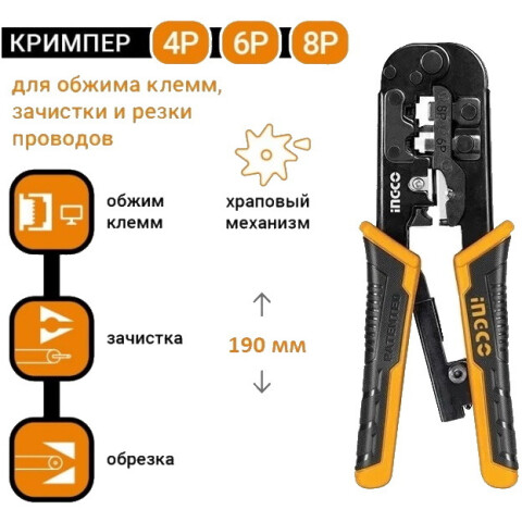 клещи для обжима витой пары и снятия изоляции, длина 190 мм, для телефонных и компьютерных разъемов RJ, сечение для снятия изоляции: 0.5-6 кв.мм, храповый механизм для облегчения работы
