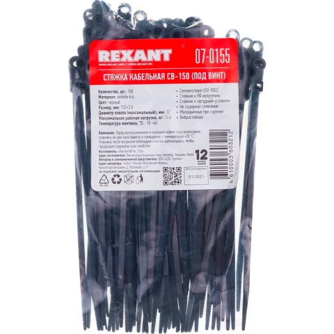 стяжка, 150 мм x 3.6 мм, диаметр охвата 32 мм, цвет: чёрный, 100 шт.
