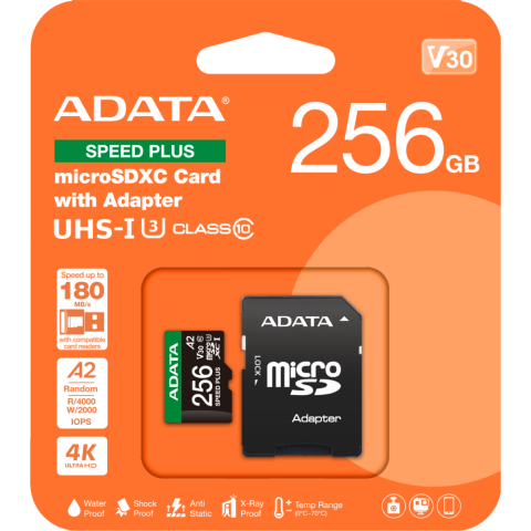 Карта памяти 256Gb MicroSD ADATA SPEED PLUS + SD адаптер (UD256GUI3V30A2SP-RA1)