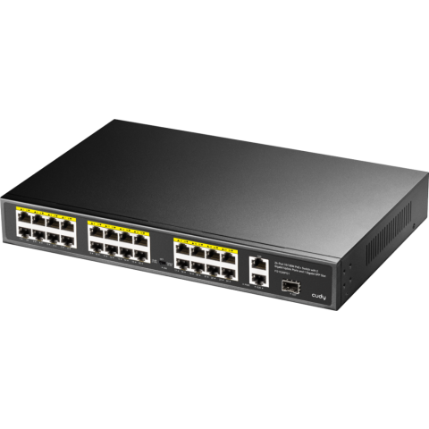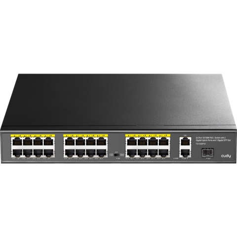24 порта Ethernet 100 Мбит/с, 2 uplink порта 1 Гбит/с, 1 порт SFP, поддержка PoE, пропускная способность 10.8 Гбит/с, 2K MAC адресов