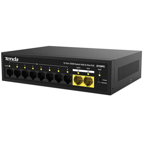 коммутатор неуправляемый, 8 портов Ethernet до 100 Мбит/с с PoE, 2 порта Uplink до 100 Мбит/с, размеры: 175 x 43 x 127 мм