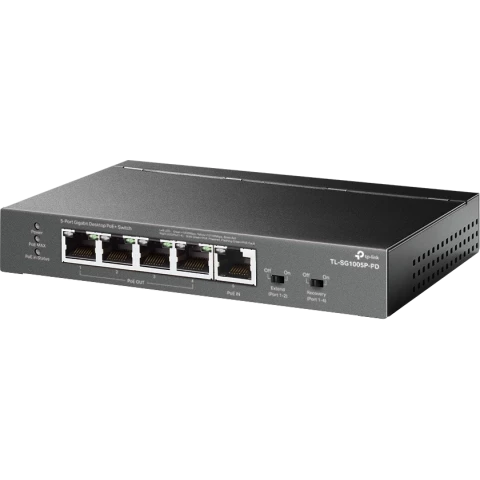 настольный коммутатор с 5 гигабитными портами, 1 порт с входящим PoE++, 4 порта с исходящим PoE+
