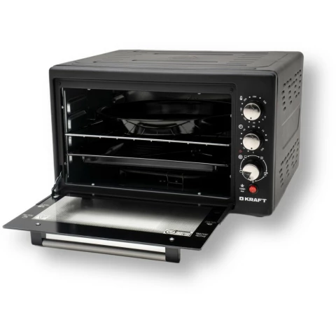объём камеры 38 л, режимы: верхний нагрев, нижний нагрев, конвекция, температура нагрева 320 °C, механический таймер, внутренняя подсветка, механическое управление, комплектация: решётка, противень, круглый противень