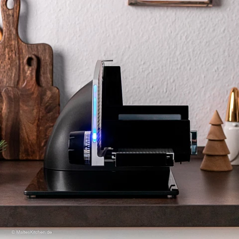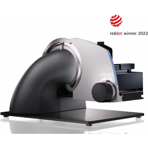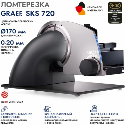 толщина нарезки до 20 мм, точная регулировка толщины реза, бесшумный двигатель 170 Вт, цельнометаллический корпус, лезвие из нерж. стали, интеллектуальная информационная подсветка, блокировка включения, основание из ударопрочного стекла
