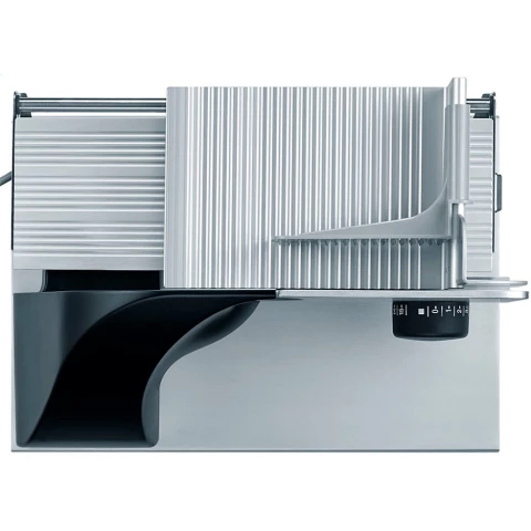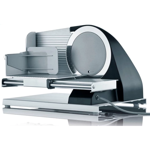 ломтерезка мощностью 185 Вт, толщина нарезки: 0-15 мм, бесшумный конденсаторный двигатель, металлический корпус, защита пальцев, поддон