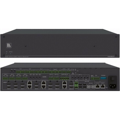 матричный коммутатор 8х8 HDMI и HDBaseT с эмбеддированием/деэмбеддированием звука, встроенным главным контроллером помещения и усилителем аудио; поддержка 4K60 4:2:0, POE