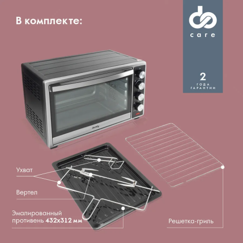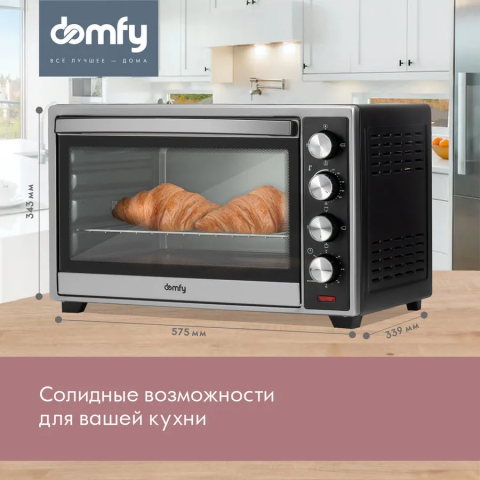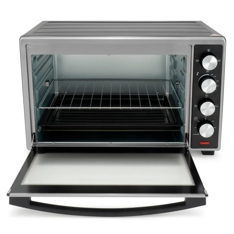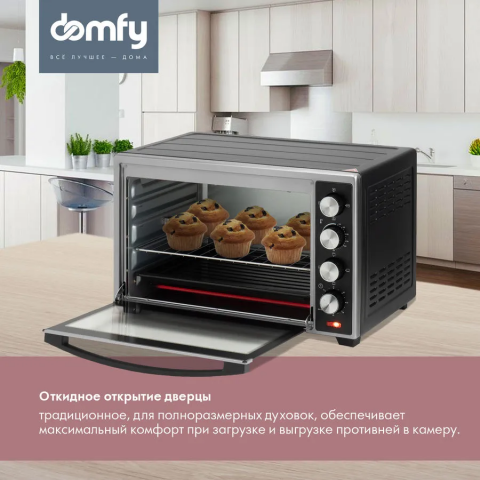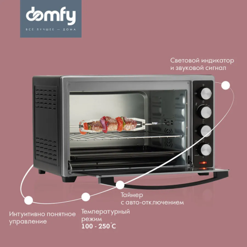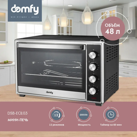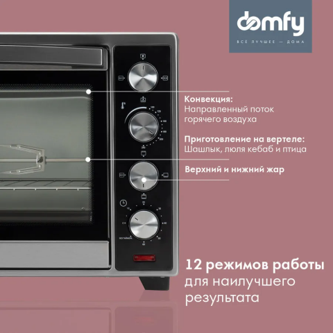 мощность 2000 Вт, объём 48 л, макс. температура 250 °C, 12 режимов работы, механическое управление, гриль, конвекция, вертел
