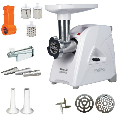 перерабатывает 1.7 кг/мин, насадка-терка, насадка для приготовления колбас, насадка для шинковки, насадка для кеббе, диск для фарша, корпус из пластика, шнековая соковыжималка, отсек для хранения насадок