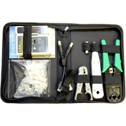 набор инструментов: обжимные клещи 8P+6P+4P, заделочный нож KRONE, нож для зачистки UTP/STP, тестер кабеля RJ45, BNC и RJ11/12, коннекторы RJ-11x20шт + RJ-45x20шт