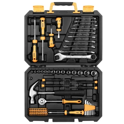 универсальный набор инструментов, количество предметов в наборе: 74 шт, присоединительный размер: 1/4", 3/8", размер торцевых головок: 5-19 мм, кейс