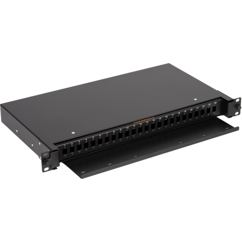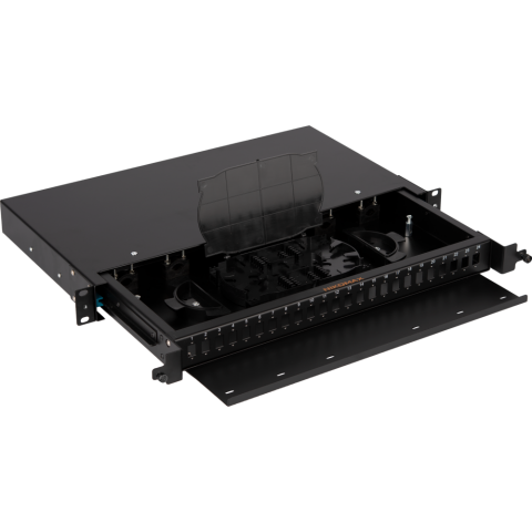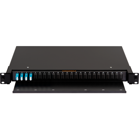 оптический кросс 19", 1U, укомплектованный на 8 портов LC/UPC (4 двойных LC/UPC адаптера), SM9/125 OS2, выдвижной, черный