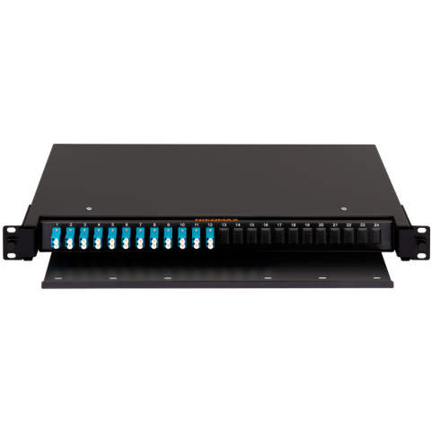 оптический кросс 19" Premium Line, 1U, укомплектованный на 24 порта LC/UPC (12 двойных LC/UPC адаптеров), SM 9/125 OS2, выдвижной, с полкой, черный, в комплекте: адаптеры, монтажные шнуры 1м, сплайс-кассета с крышкой, гильзы, заглушки
