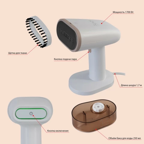 ручной отпариватель, мощность: 1700 Вт, максимальная подача пара: 32 г/мин, время работы: 10 мин, объём бака: 0.25 л