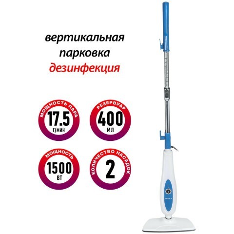 напольный паровая швабра, мощность: 1500 Вт, максимальная подача пара: 17.5 г/мин, время работы: 20 мин, объём бака: 0.4 л