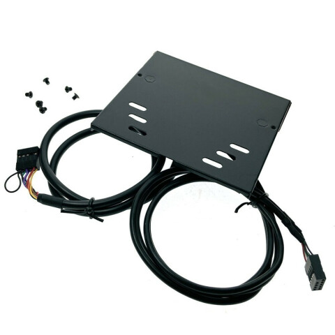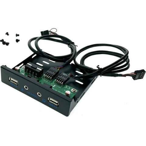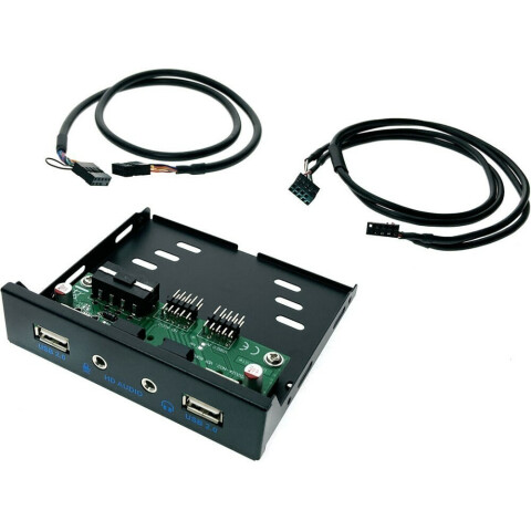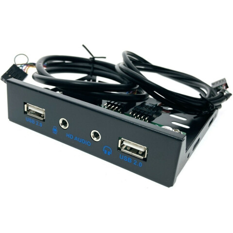 планка устанавливается в 3.5" отсек, подключается к 10-pin разъему и аудио разъёму платы, добавляет 2 порта USB 2.0, и два аудиоразъёма mini jack 3.5 мм, кабель 55 см