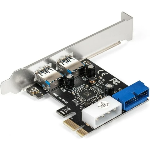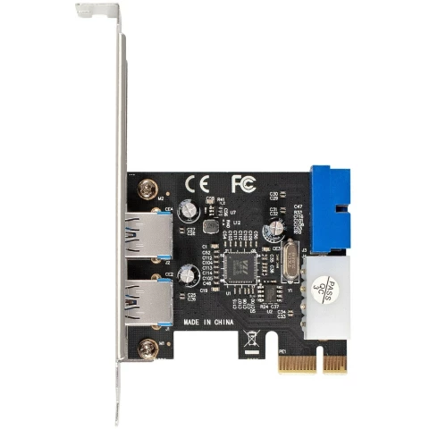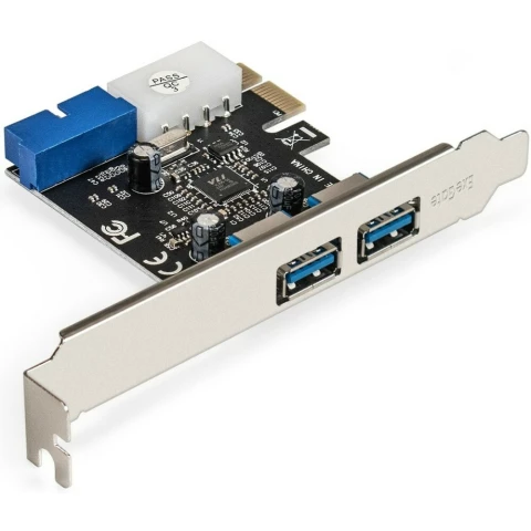 низкопрофильная плата расширения PCI-E x1 v2.0, добавляет 2 внешних порта USB 3.0 и разъем 19-pin (внутренние коннекторы) для подключения 2-х USB 3.0 портов на корпусе, разъем дополнительного питания: Molex
