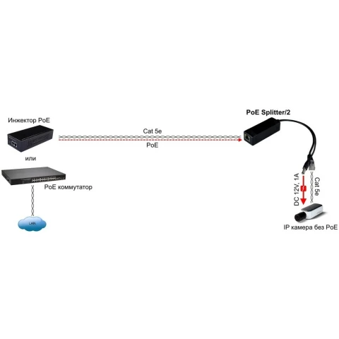 PoE сплиттер, разделяющий входящий Fast Ethernet сигнал с PoE отдельно на канал передачи данных и канал передачи питания 12V, поддержка стандарта PoE IEEE 802.3af, вх. напр.: 36 - 57V, грозозащита на входе 4kV, удобный для подключения кабель 17см