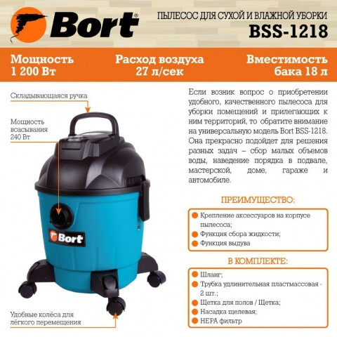 влажная, сухая уборка, пылесборник 18 л, мощность 1200 Вт, диаметр шланга 32 мм, длина шланга 2 м, длина кабеля питания 4 м, работа на выдув