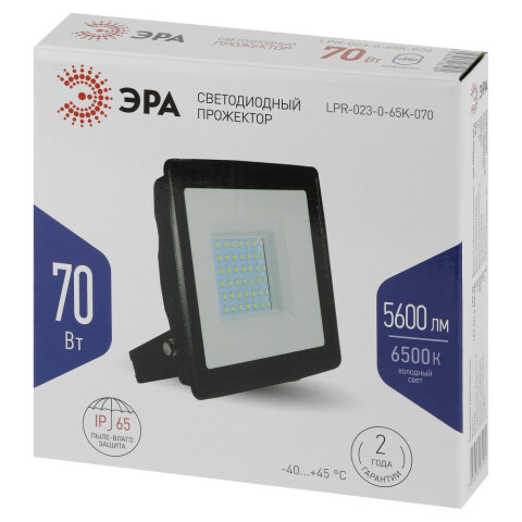 Бренд: ЭРАпрожектор на дуге крепления, источник света: светодиоды, мощность 70 Вт, холодный белый цвет, цветовая температура 6500 K, световой поток 5600 Лм, IP65