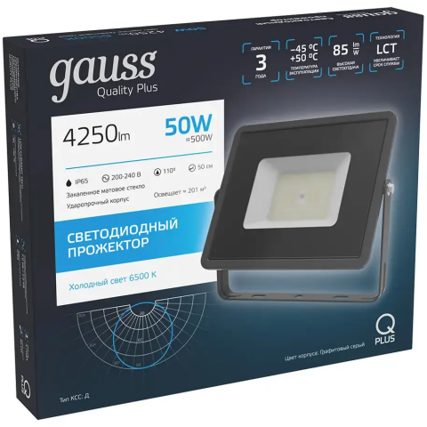 прожектор на дуге крепления, источник света: светодиоды, мощность 50 Вт, холодный белый цвет, цветовая температура 6500 K, световой поток 4250 Лм, до 35000 ч работы, IP65