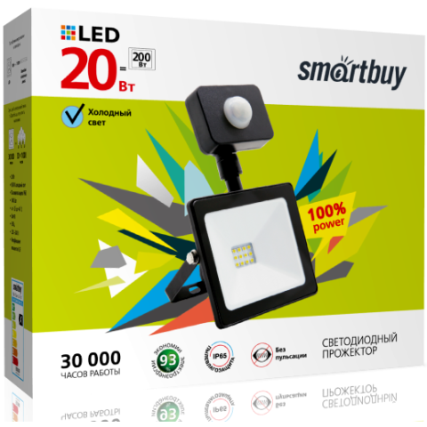 Бренд: SmartBuyпрожектор на дуге крепления, источник света: светодиоды, мощность 20 Вт, холодный белый цвет, цветовая температура 6500 K, световой поток 1600 Лм, до 30000 ч работы, датчик движения, IP65