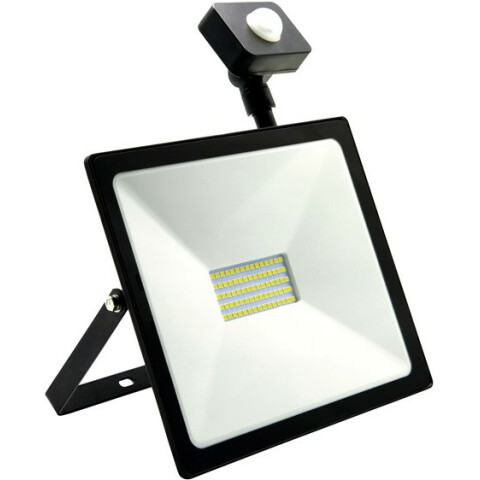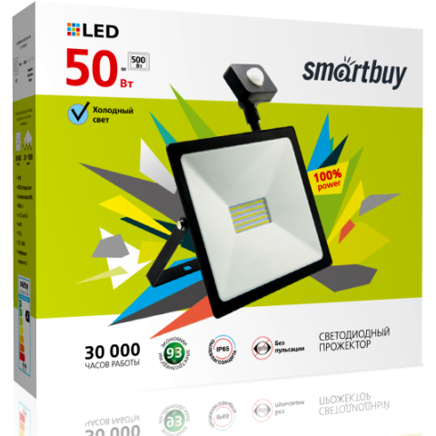 Бренд: SmartBuyпрожектор на дуге крепления, источник света: светодиоды, мощность 50 Вт, холодный белый цвет, цветовая температура 6500 K, световой поток 4000 Лм, до 30000 ч работы, датчик движения, IP65