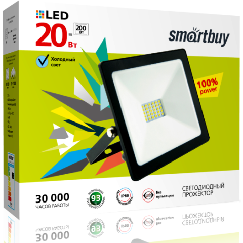 Бренд: SmartBuyпрожектор на дуге крепления, источник света: светодиоды, мощность 20 Вт, холодный белый цвет, цветовая температура 6500 K, световой поток 1600 Лм, до 30000 ч работы, IP65
