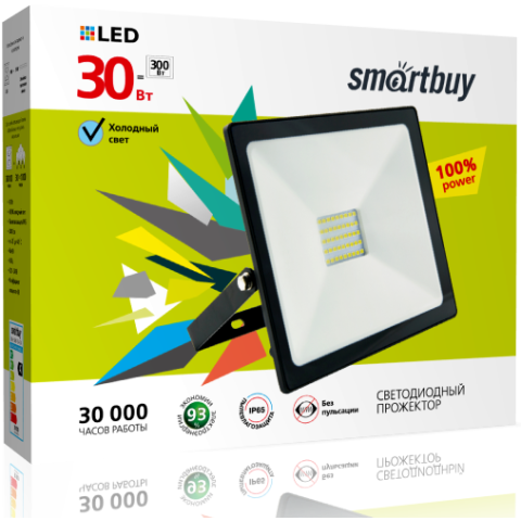 Бренд: SmartBuyпрожектор на дуге крепления, источник света: светодиоды, мощность 30 Вт, холодный белый цвет, цветовая температура 6500 K, световой поток 2400 Лм, до 30000 ч работы, IP65