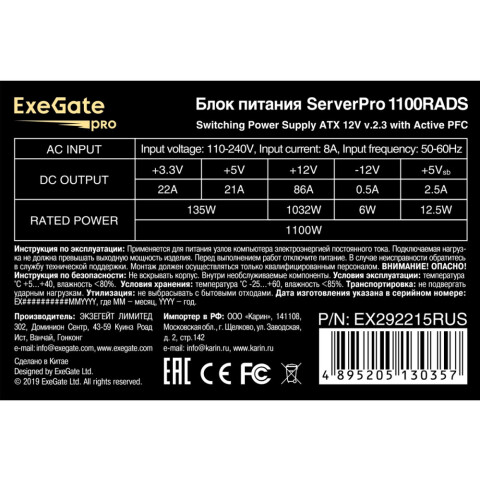 Серверный корпус ExeGate Pro 2U350-033/1100RADS 1100W (EX298272RUS)