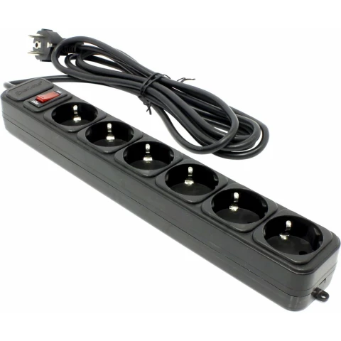 сетевой фильтр, 6 розеток, макс. нагрузка 2200 Вт, макс. ток 10 А, заземление, выключатель на корпусе, длина кабеля: 3 м, чёрный