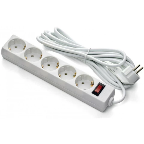 | удлинитель, 5 розеток, макс. нагрузка 2200 Вт, макс. ток 10 А, выключатель на корпусе, заземление, длина кабеля: 5 м, белый | 171 смн. |