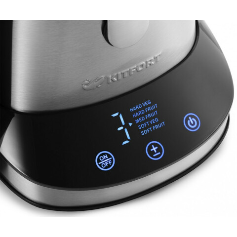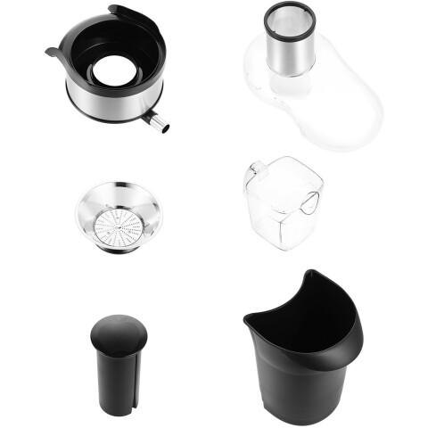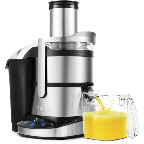 центробежная соковыжималка, мощность 1100 Вт, стакан для сока в комплекте, автоматический выброс мякоти, отсекатель пены сока, корпус из нержавеющей стали, возможность загрузки целых плодов