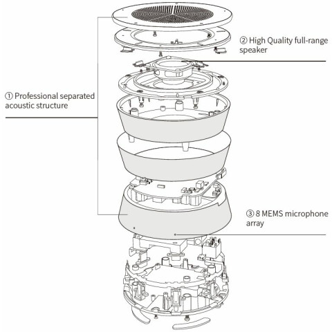 спикерфон Nearity для конференций, расстояние захвата: 5 м, 8-элементный микрофон, шумо-эхоподавление, AGC, каскадирование до 4 (8 с инжектором) устройств