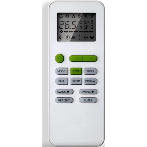 площадь помещения до 25 кв. м., мощность охлаждения 2640 Вт, режимы: охлаждение, осушение, вентиляция, ночной, обогрев, уровень шума 37 дБ, дисплей, пульт ДУ