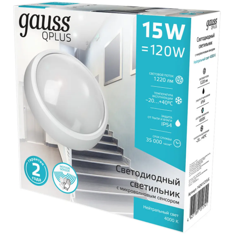 настенно-потолочный светильник, накладной, мощность 15 Вт, цветовая температура 4000 K, световой поток 1200 Лм, датчик движения, IP54