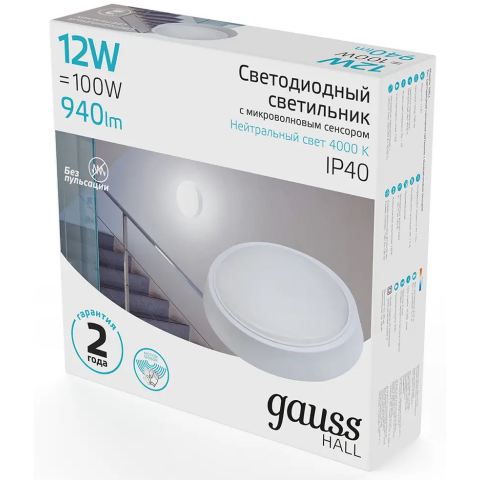 настенно-потолочный светильник, накладной, мощность 12 Вт, цветовая температура 4000 K, световой поток 940 Лм, датчик движения, IP40