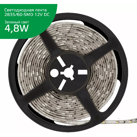 светодиодная лента длиной 5 м, зелёный цвет, светодиоды SMD 2835, мощность 4.8 Вт/м, питание 12 В, IP66